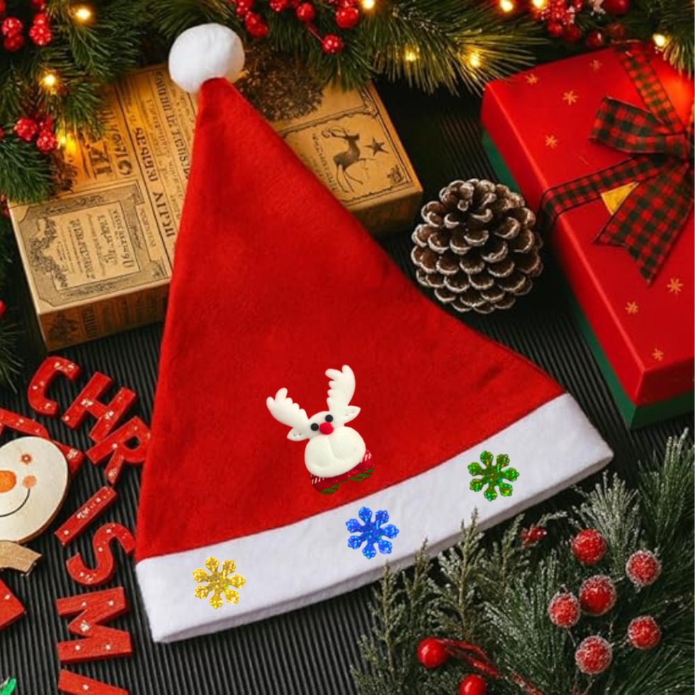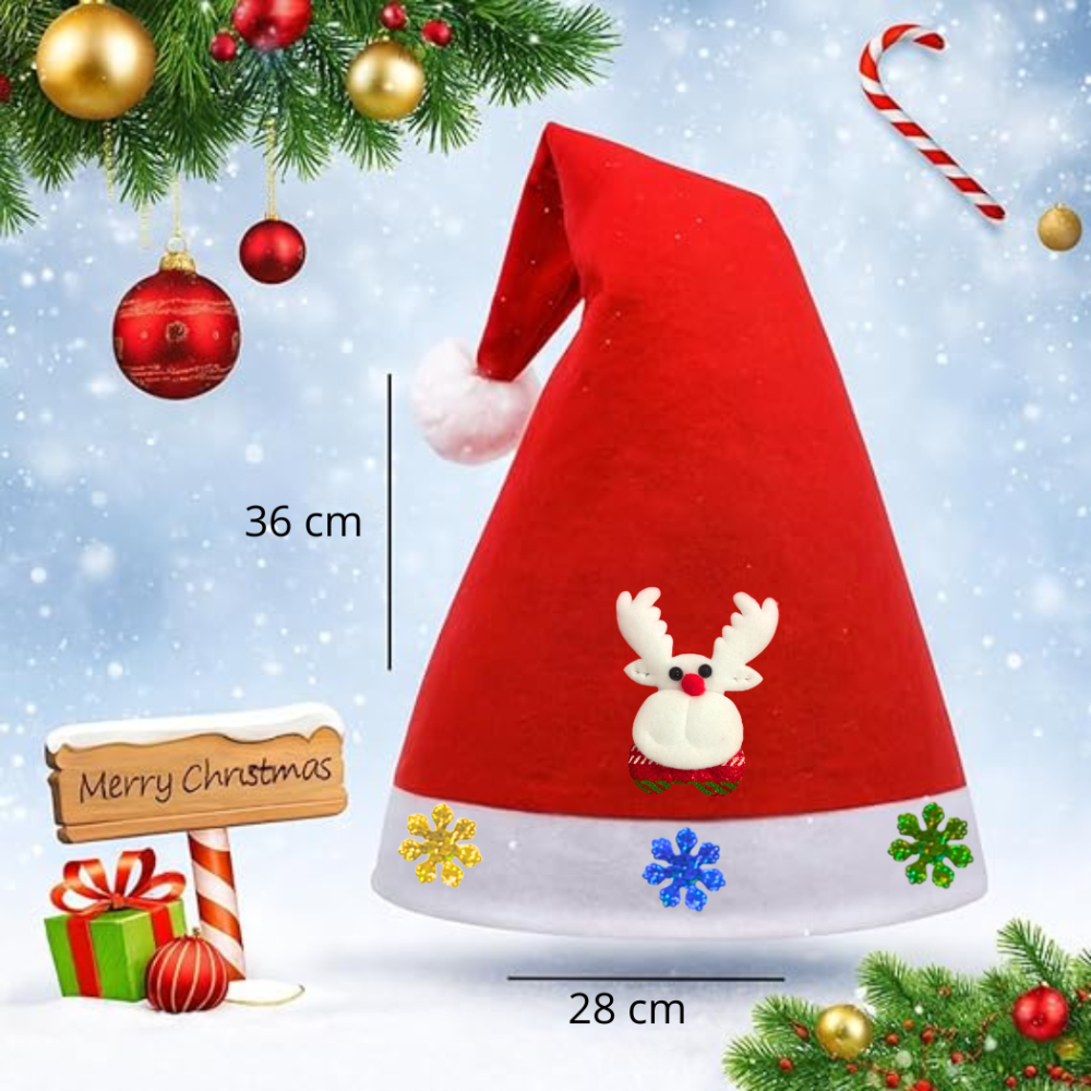 O gorro é oferecido em Tamanho Único para adultos, com dimensões de 36 cm de altura e 28 cm de largura, permitindo que se ajuste a diversos tamanhos de cabeça. É um item ideal para ser usado em festas de Natal, eventos temáticos, ou para complementar a decoração natalina de forma divertida
