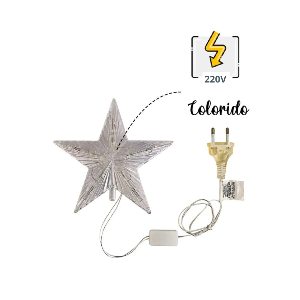 -Instalação: Possui um suporte na base para encaixe seguro no topo da árvore e um cabo de alimentação para conexão direta à tomada 220V.