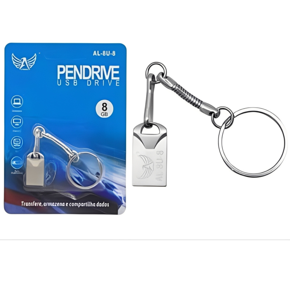 Este é um pendrive no formato de chaveiro modelo AL-8U-8, oferecendo 8 Gigabytes (GB) de capacidade de armazenamento. Destaca-se por ser uma unidade flash USB de alta velocidade, proporcionando transferências de arquivos mais rápidas e eficientes.