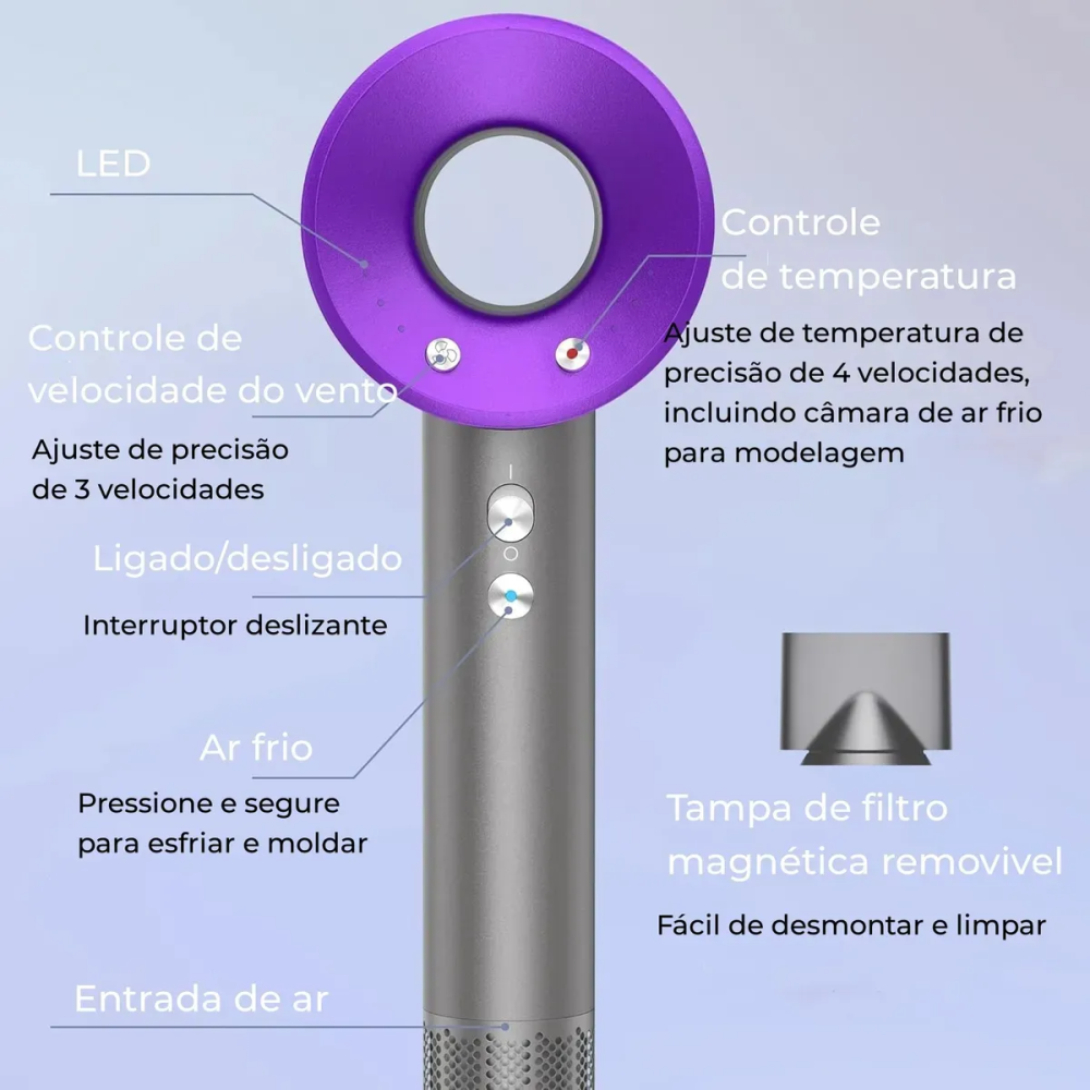 -Múltiplas Configurações de Temperatura: Geralmente oferece 3 ou 4 configurações de temperatura (ar frio, morno e quente), proporcionando controle preciso para evitar o superaquecimento e danos aos fios.