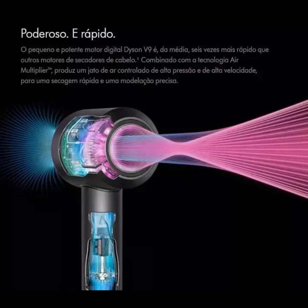 -Motor Digital de Alta Velocidade: Utiliza um motor digital que é mais leve, mais silencioso e significativamente mais durável do que os motores tradicionais de secadores. Este tipo de motor permite um fluxo de ar de alta velocidade e precisão.