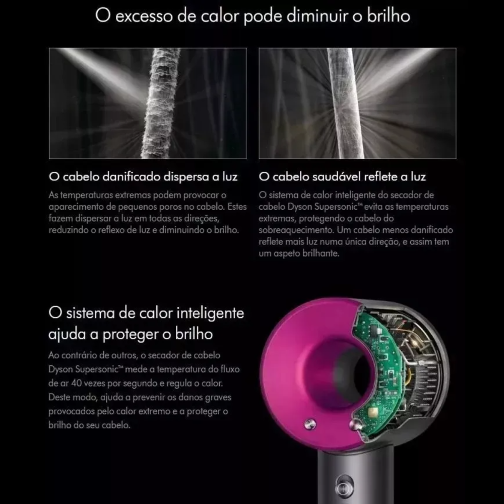 -Sensor de Temperatura Inteligente (Termistor): Inclui um sensor que monitora a temperatura do fluxo de ar até 40 vezes por segundo, ajustando-a automaticamente para evitar danos por calor excessivo, protegendo a saúde do cabelo.
