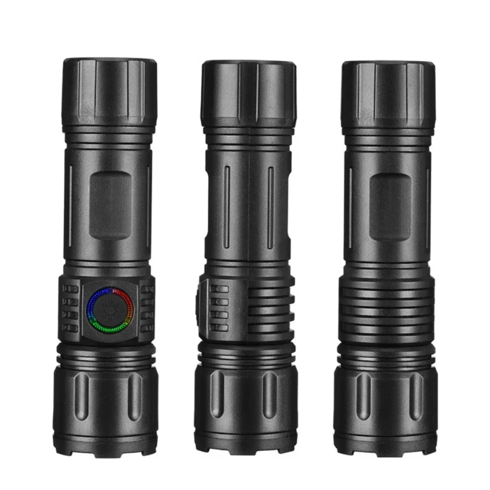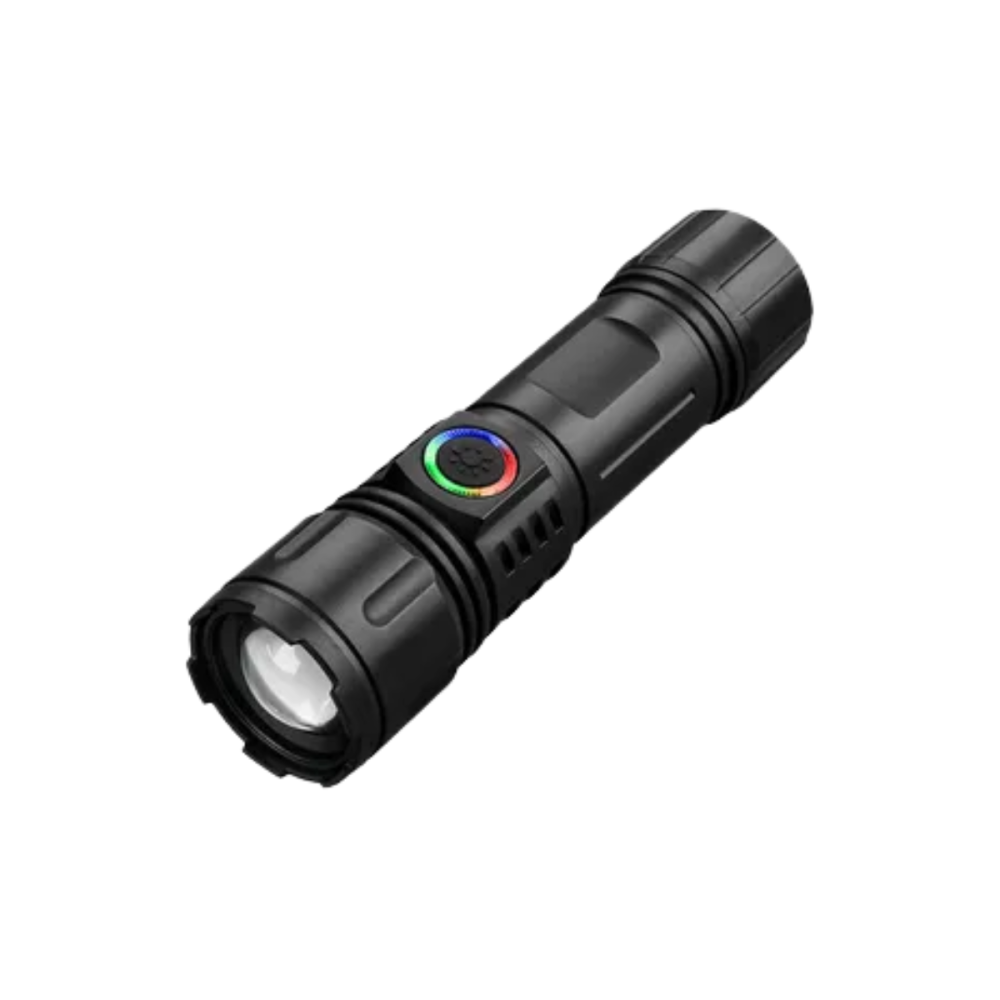 -Indicador de Carga: Um pequeno LED no corpo da lanterna indica o status de recarga (vermelho para carregando, verde/azul para carga completa).
