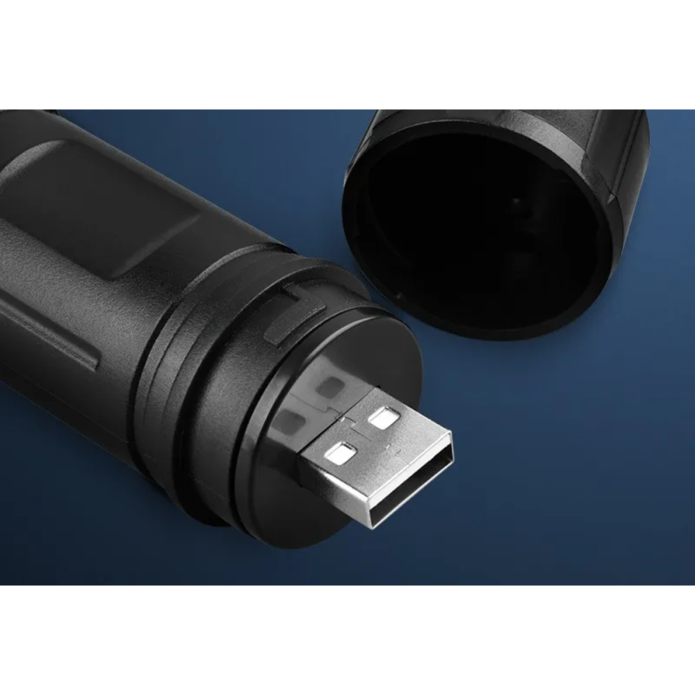 -Carregamento: A lanterna é recarregada através de uma porta USB, permitindo o uso de adaptadores de celular, computadores, notebooks e power banks, sem a necessidade de pilhas descartáveis.