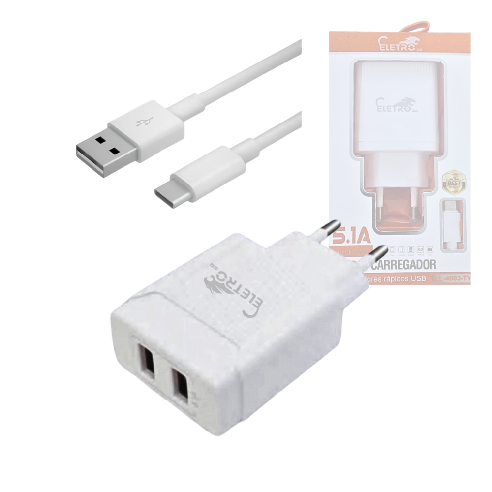 O Carregador EL-4003-TY é um kit carregador de parede completo, composto por uma fonte de alimentação com duas portas USB e um cabo Tipo-C avulso, projetado para oferecer carregamento rápido e eficiente.