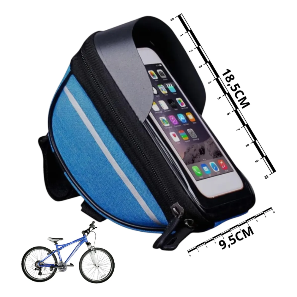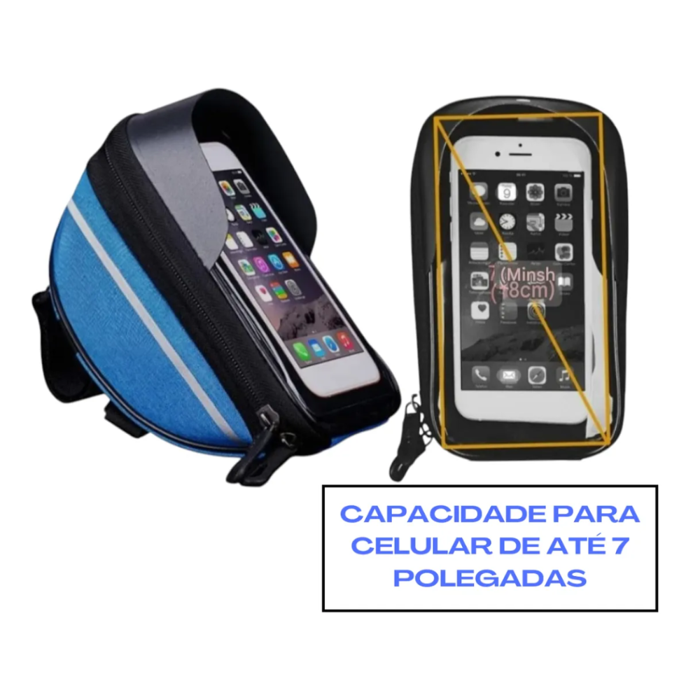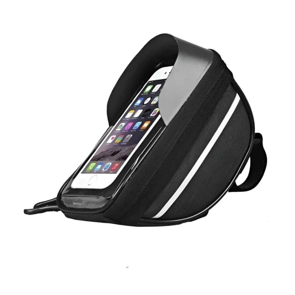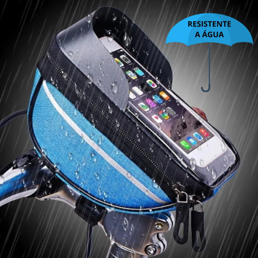 Seu grande diferencial é o suporte para celular com capa transparente sensível ao toque, que permite utilizar o smartphone para GPS, aplicativos de ciclismo ou música sem precisar retirá-lo da bolsa. Além disso, é impermeável, protegendo seus itens contra chuva, respingos e poeira.