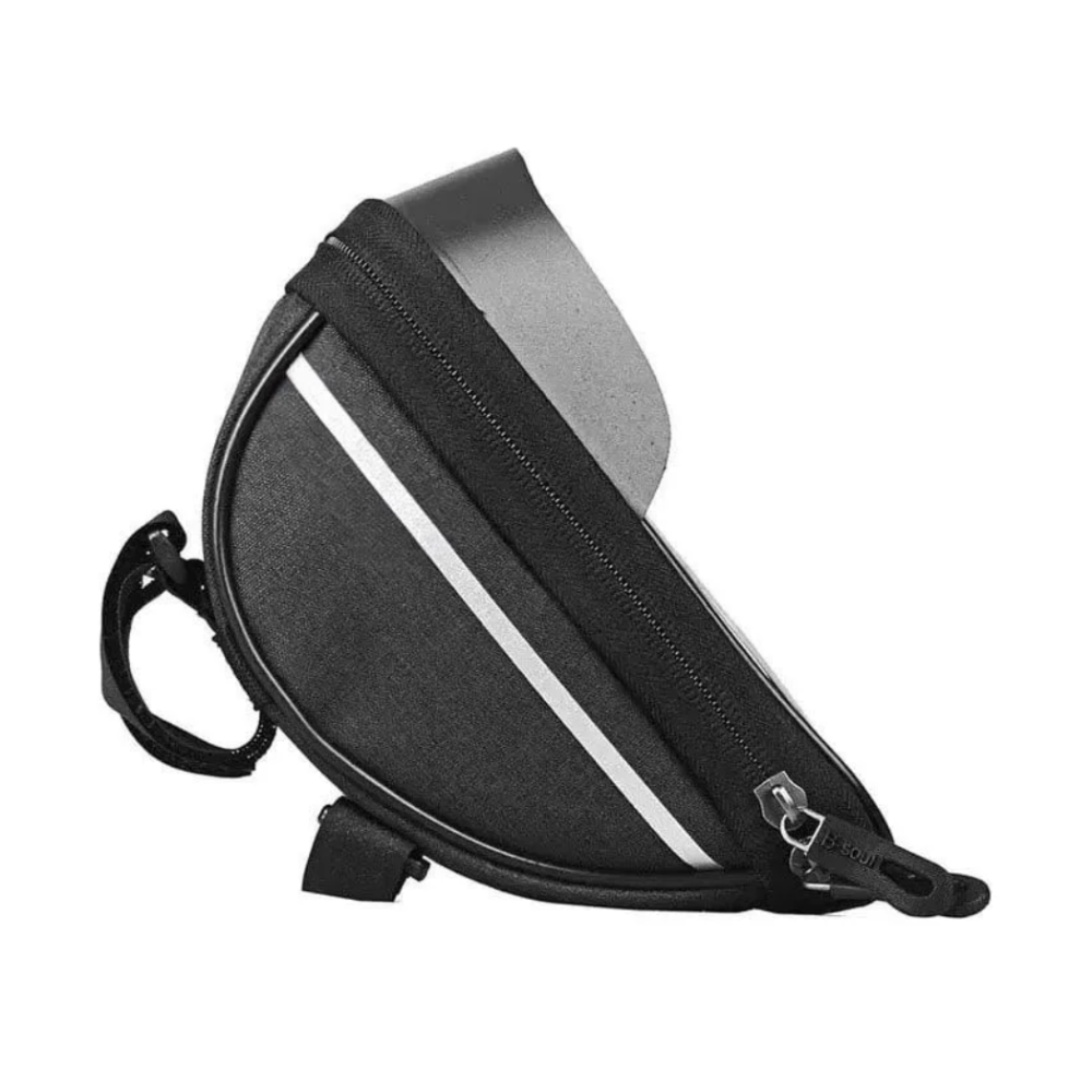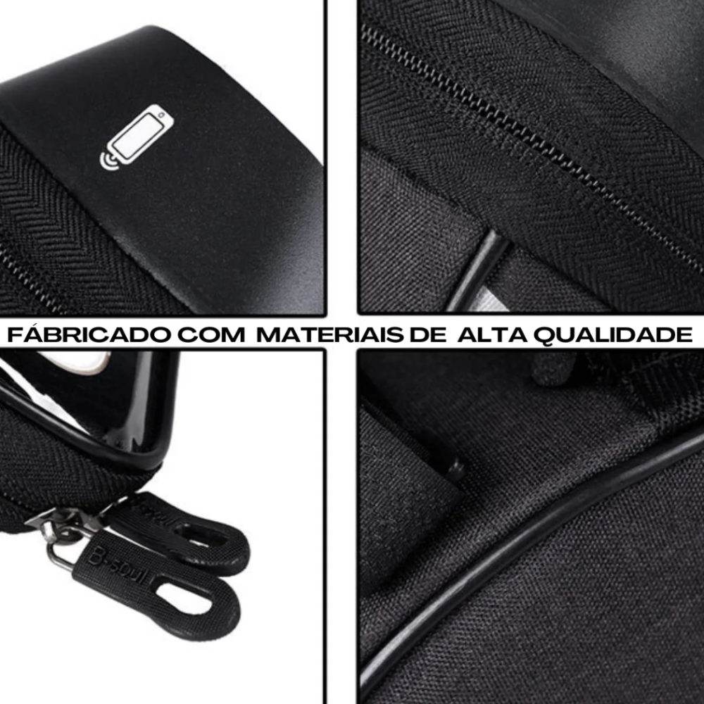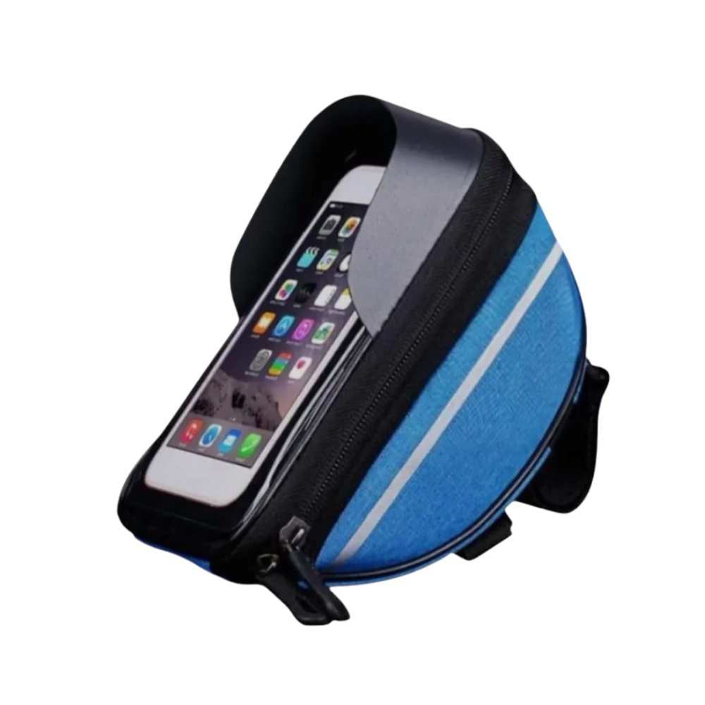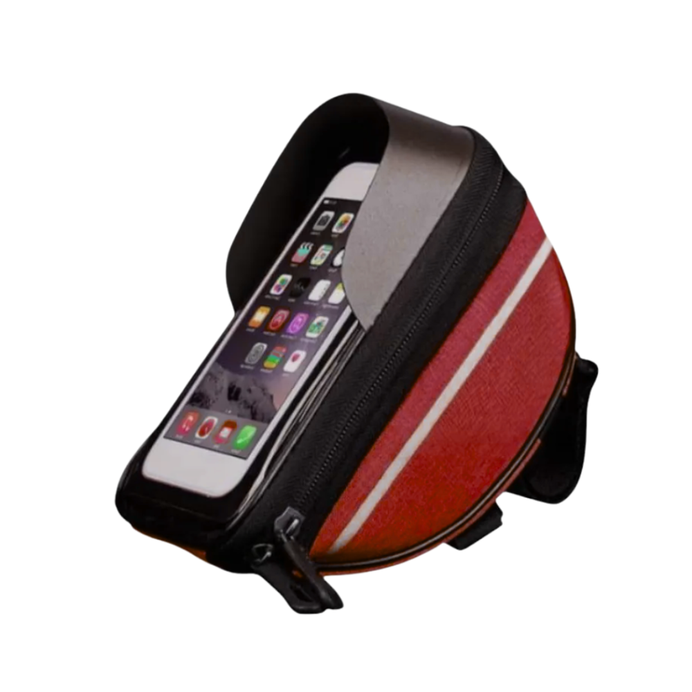 Seu grande diferencial é o suporte para celular com capa transparente sensível ao toque, que permite utilizar o smartphone para GPS, aplicativos de ciclismo ou música sem precisar retirá-lo da bolsa. Além disso, é impermeável, protegendo seus itens contra chuva, respingos e poeira.