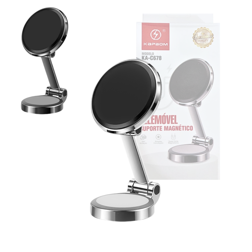 O Suporte KA-C678 é um acessório discreto e universal que utiliza a força magnética para fixar smartphones em qualquer superfície plana do veículo ou em casa, garantindo fácil acesso e segurança.