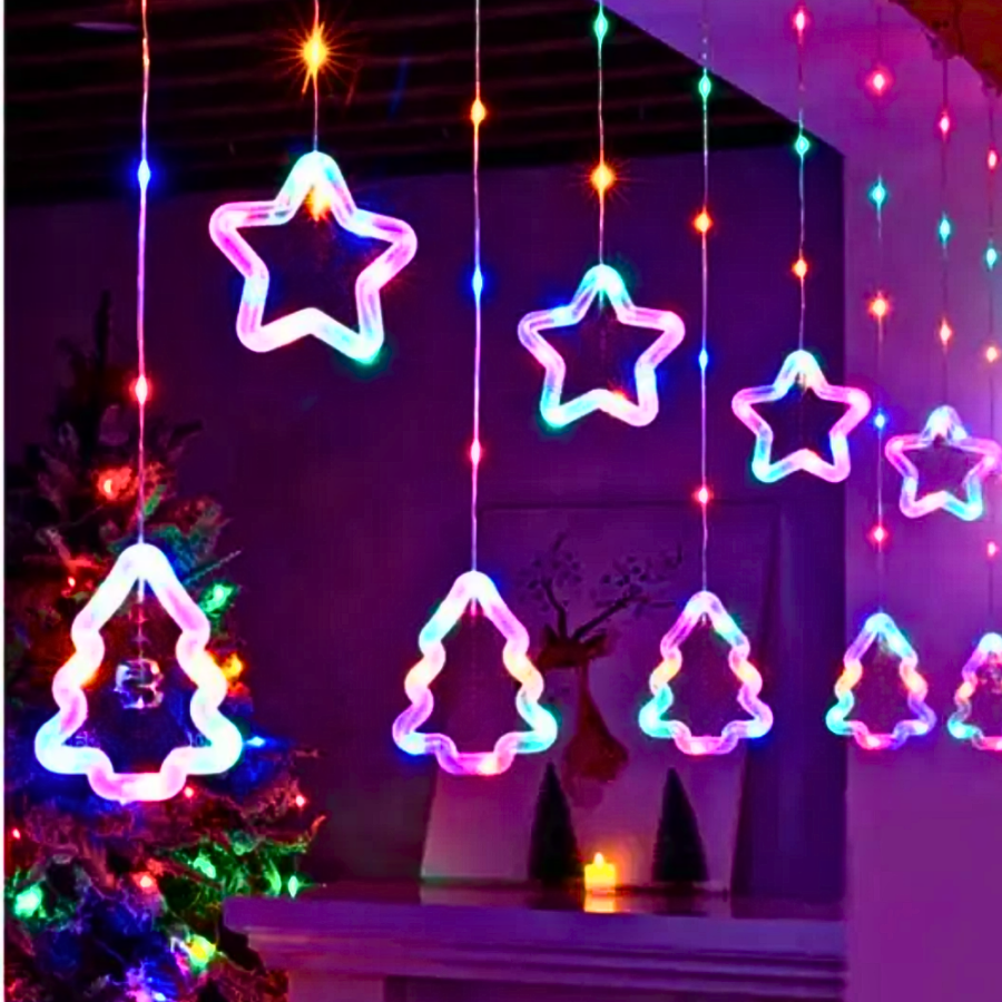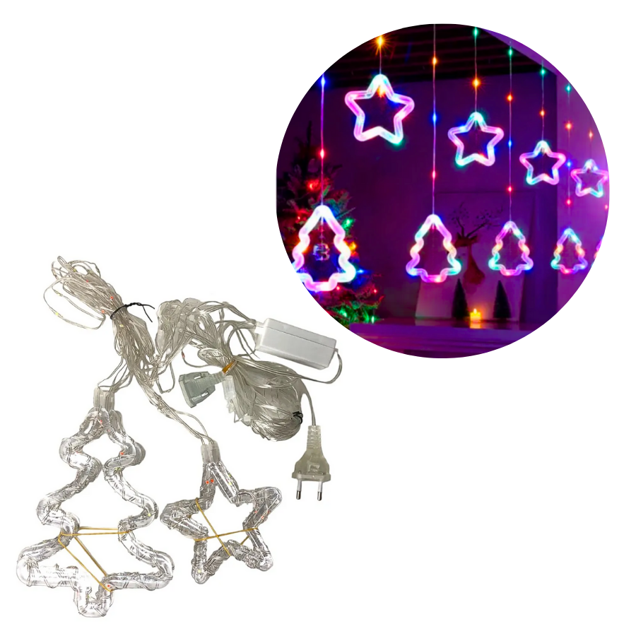 Pisca Cortina Cascata LED Colorido Estrela e Arvore Natalina Bivolt
