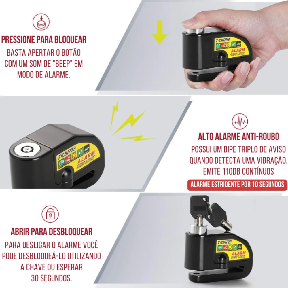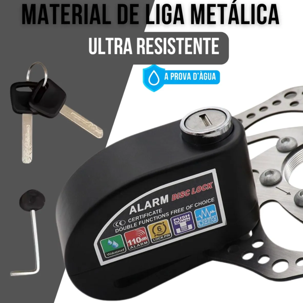 -Sistema de Alarme: Possui um sensor de movimento integrado. O alarme é ativado com vibração ou movimento brusco da moto após o travamento.