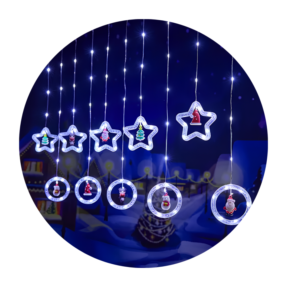 O modelo AL-4870 é um conjunto de luzes decorativas LED indicado para uso em decorações natalinas e ambientes festivos. O produto é confeccionado em estilo cortina, com fios transparentes e iluminação multicolorida. Possui miniaturas temáticas de Papai Noel, árvore de Natal e boneco de neve, que complementam a decoração com detalhes visuais característicos da época.