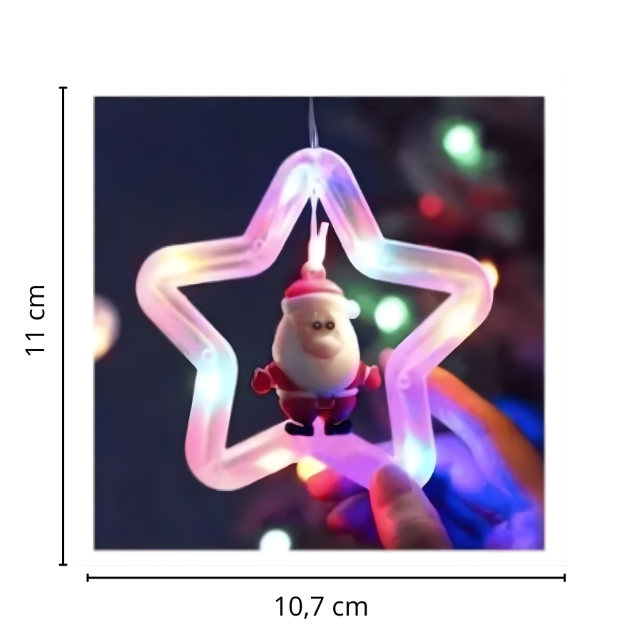O modelo AL-4870 é um conjunto de luzes decorativas LED indicado para uso em decorações natalinas e ambientes festivos. O produto é confeccionado em estilo cortina, com fios transparentes e iluminação multicolorida. Possui miniaturas temáticas de Papai Noel, árvore de Natal e boneco de neve, que complementam a decoração com detalhes visuais característicos da época.