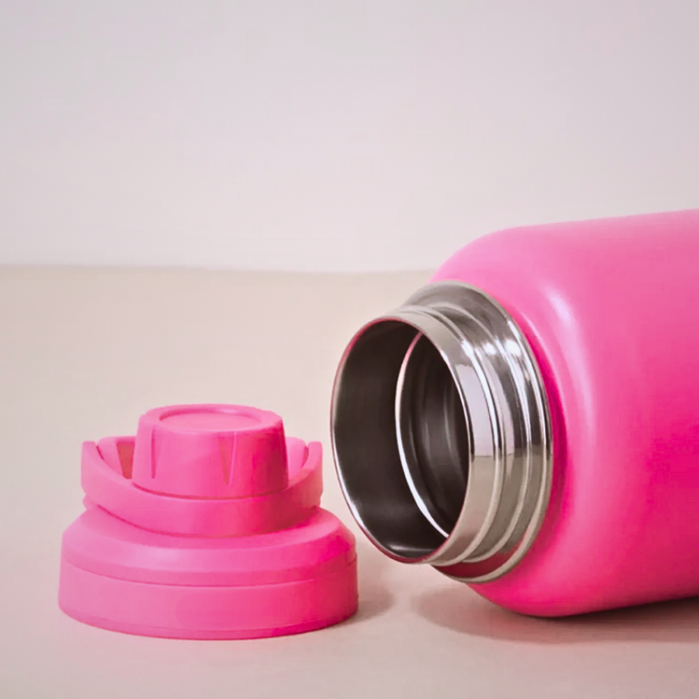 Aço Inoxidável 18/18. Isolamento a vácuo, sem condensação. Resistente à corrosão e oxidação. Livre de BPA. Abertura Hermética, parede dupla.