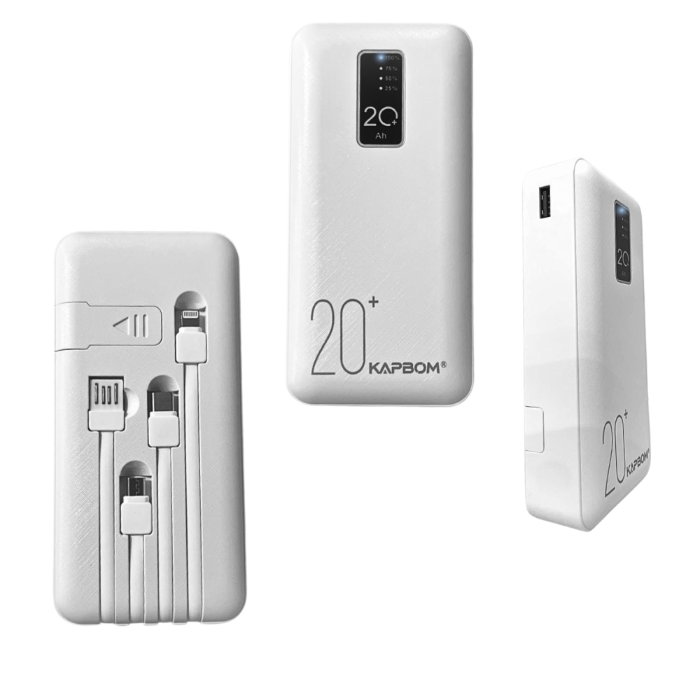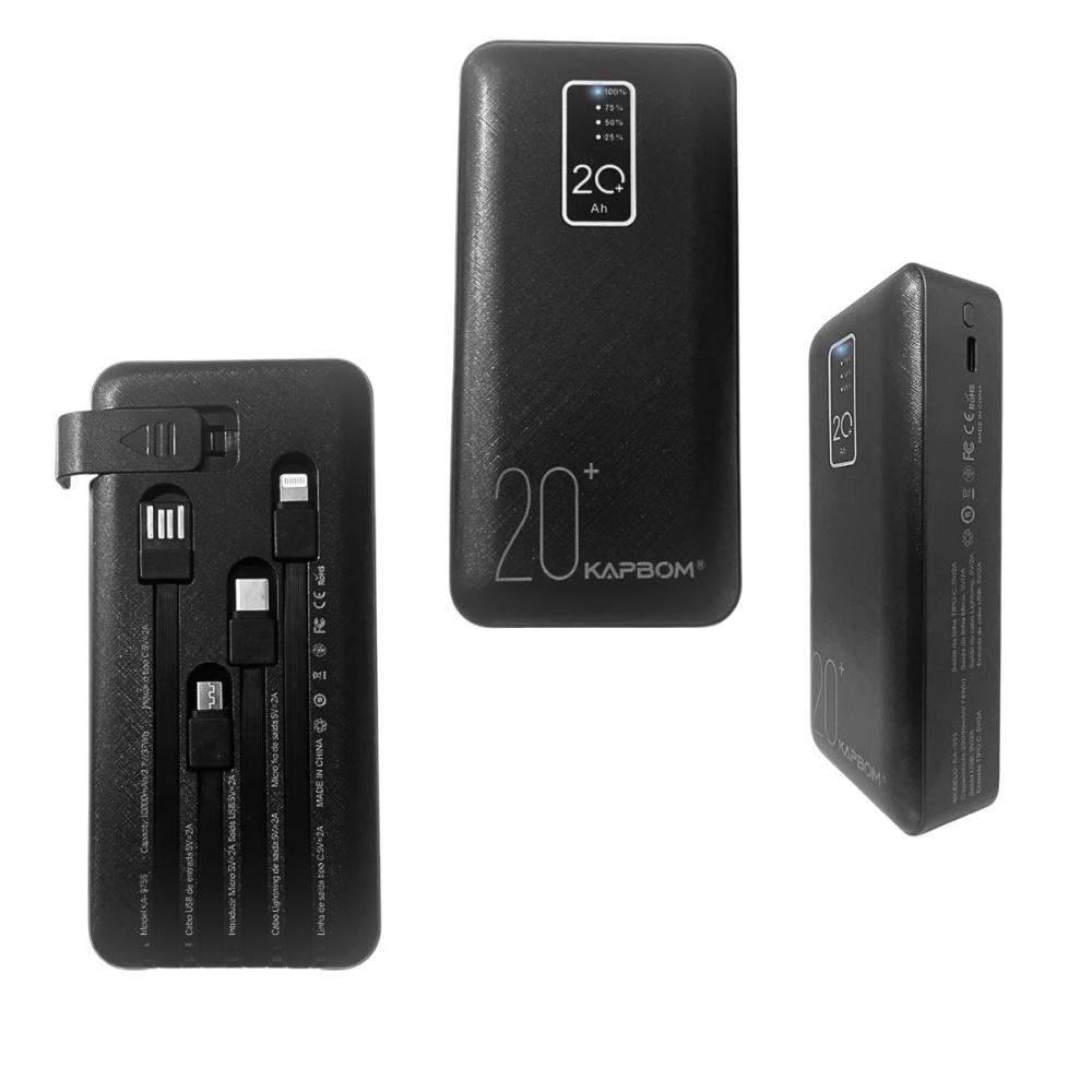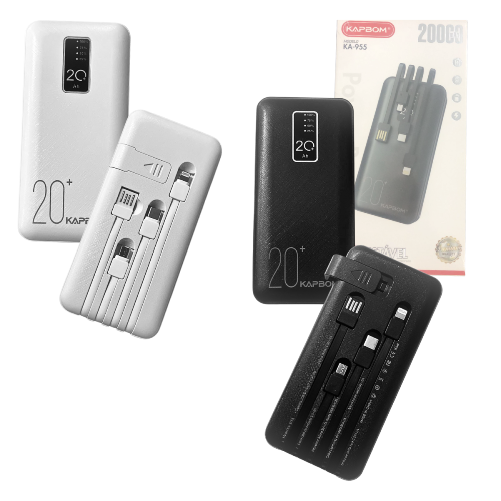 O Power Bank KA-955 é um carregador portátil de alta capacidade, projetado para fornecer energia estável e eficiente em qualquer lugar. Com bateria de 20.000mAh e potência de 10W, o modelo garante recargas confiáveis para diferentes dispositivos. Assim como outros produtos da marca, traz cabos integrados, facilitando o uso sem precisar de cabos extras. Ideal para quem procura praticidade, compatibilidade e autonomia no dia a dia.
