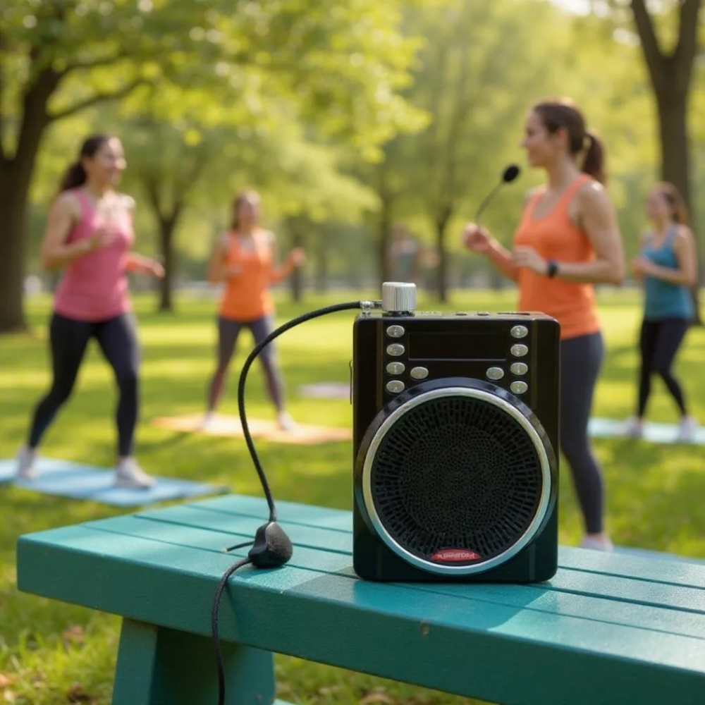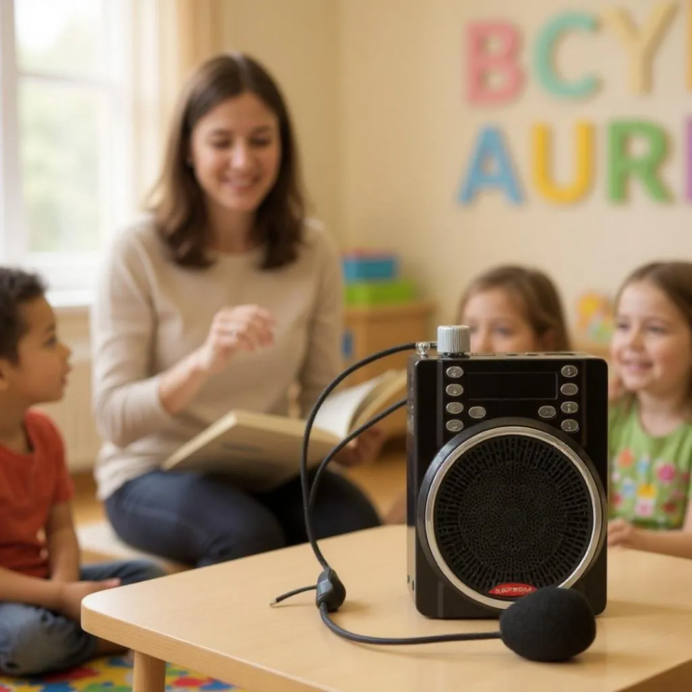 A potência sonora é adequada para cobrir salas de aula de tamanho médio a grande, garantindo que os alunos do fundo ouçam tão bem quanto os da frente. O aparelho é alimentado por uma bateria interna recarregável de íon-lítio, que oferece autonomia para várias horas de uso contínuo, sendo recarregada via cabo USB comum.