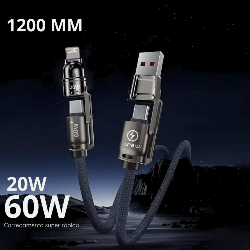 Cabo de dados 4 em 1 (USB/2x TPC/Lightning) 60W de 1,20 metros