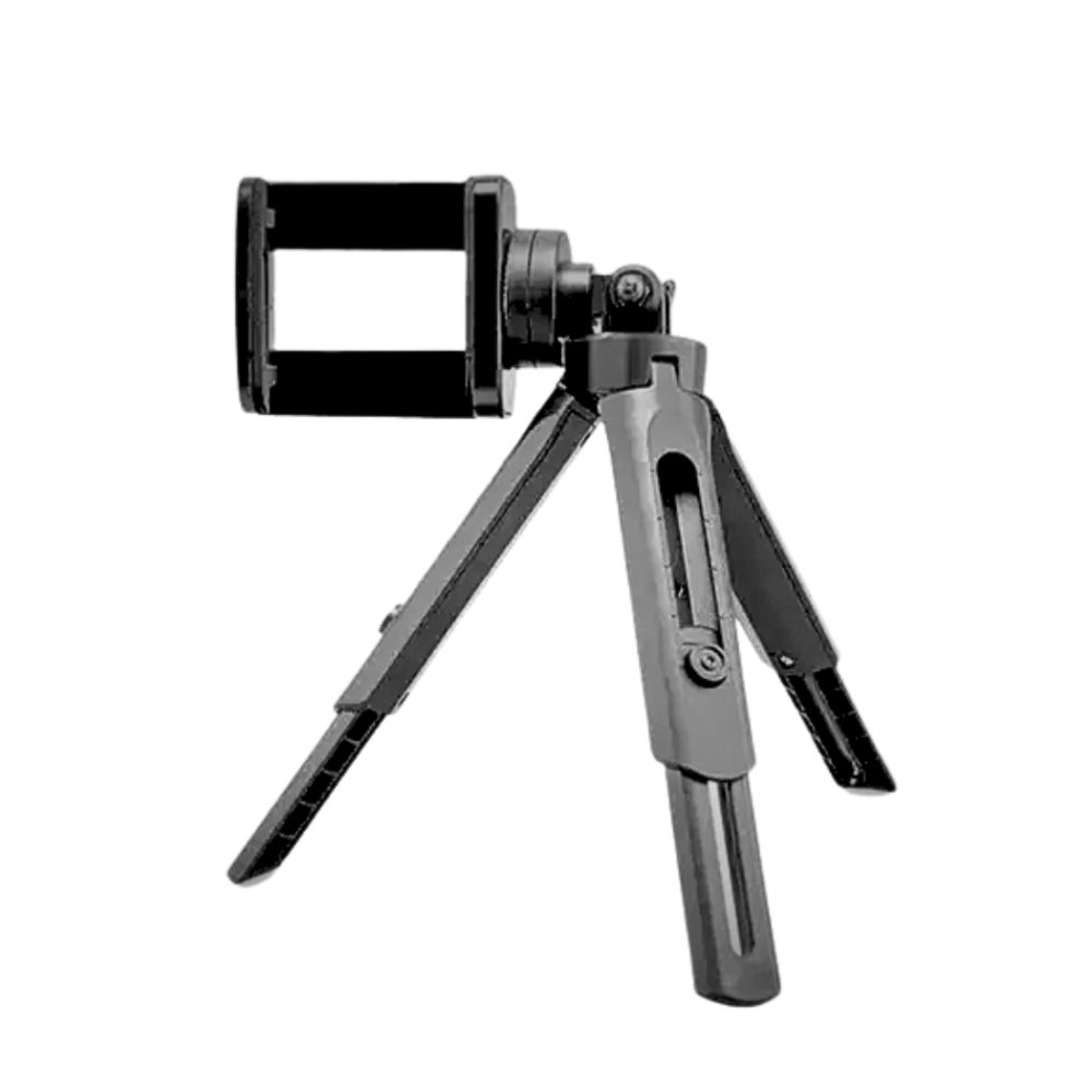 Com design moderno, possui tripé dobrável, estrutura resistente e cabeça giratória com rotação 360°, garantindo o melhor ângulo de visualização.