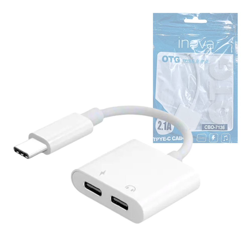 O Cabo Adaptador OTG Tipo-C INOVA CBO-7136 é a solução ideal para quem deseja utilizar fones de ouvido com entrada Tipo-C e carregar o aparelho ao mesmo tempo.