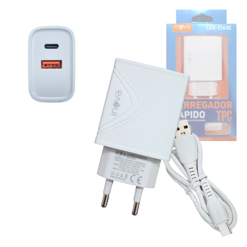 Carregador Completo Rápido 40W USB / TIPO-C de 1 Metro INOVA CAR-3163C