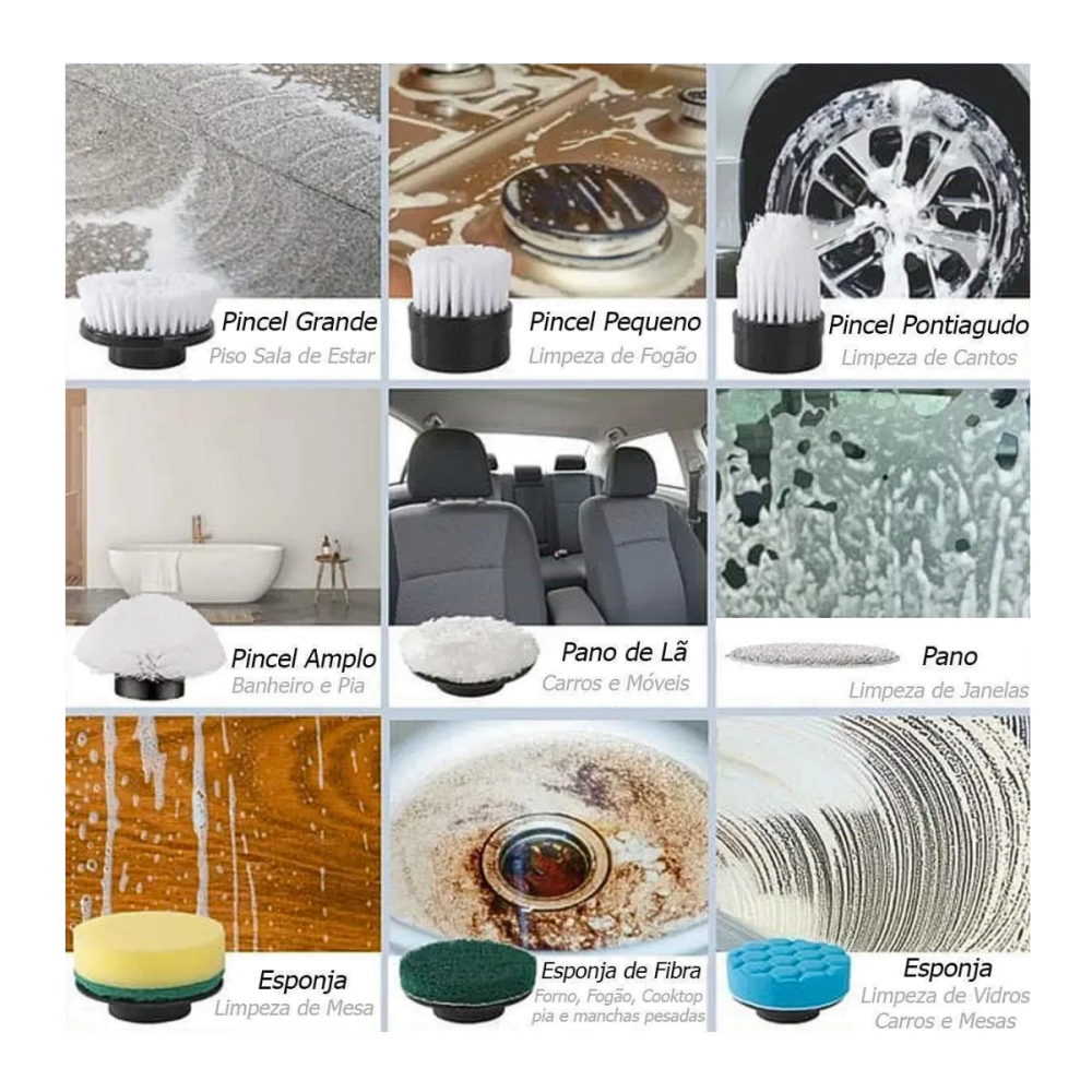 -9 Cabeças de Limpeza: O kit mais completo do mercado, com escovas para cantos, frestas, superfícies planas, fibras para gordura e esponjas de polimento.