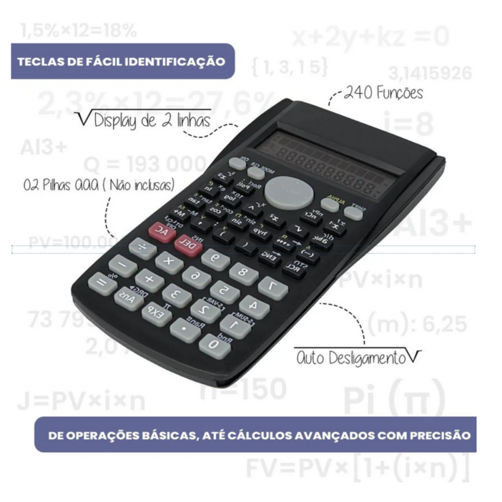 -240 Funções Científicas: Oferece uma vasta gama de funções matemáticas, trigonométricas, logarítmicas, exponenciais, estatísticas, de memória e muito mais, atendendo às necessidades de diversos cálculos científicos e acadêmicos.
