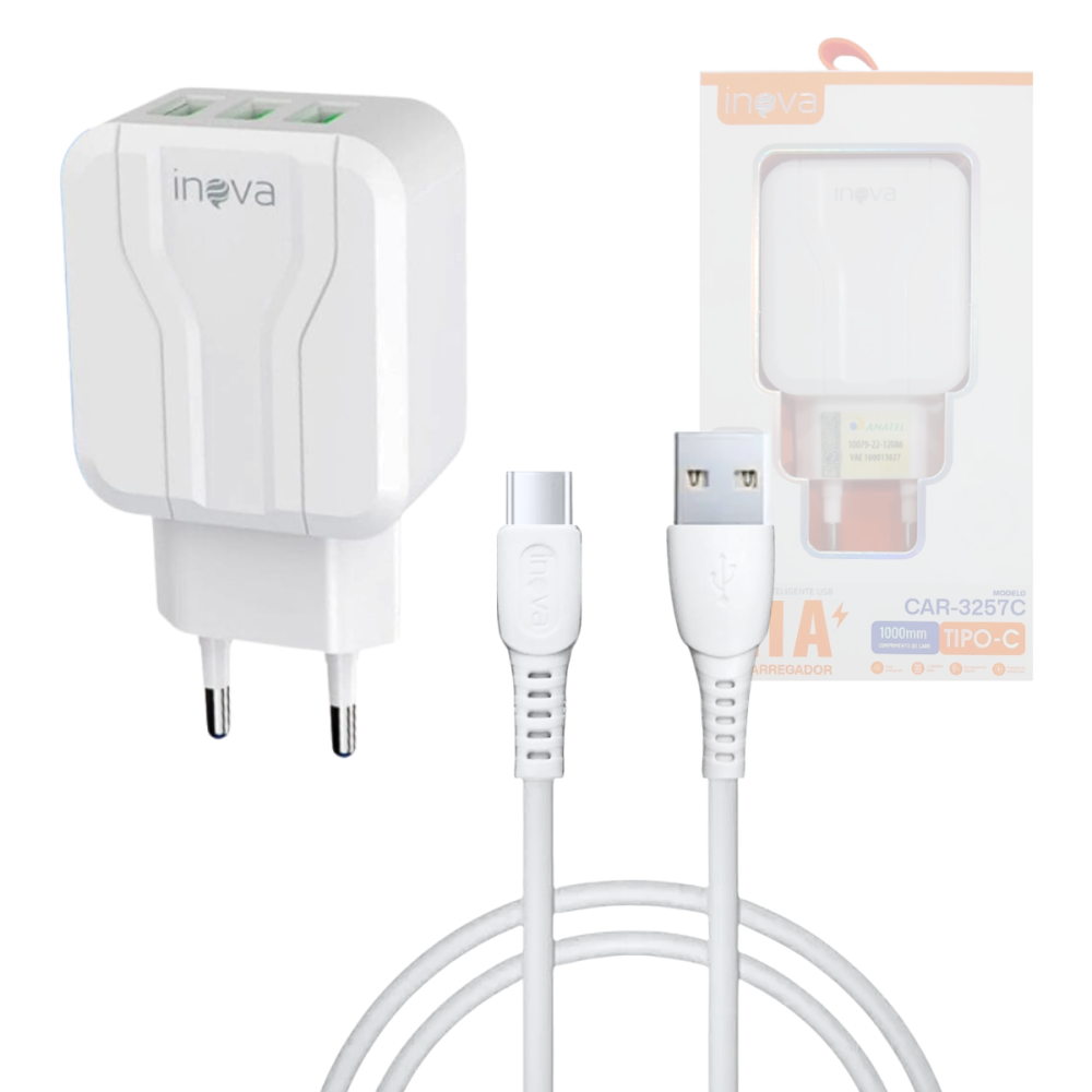 -- Carregador Completo TURBO 03 Entradas USB 5.1A com Cabo TIPO-C de 1 Metro INOVA CAR-3257C