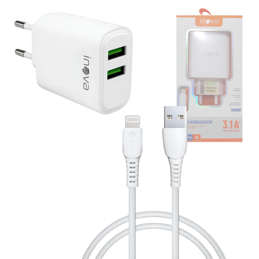 -- Carregador Completo 02 Entradas USB 3.1A com Cabo Lightning de 1 Metro i6 INOVA CAR-12820A