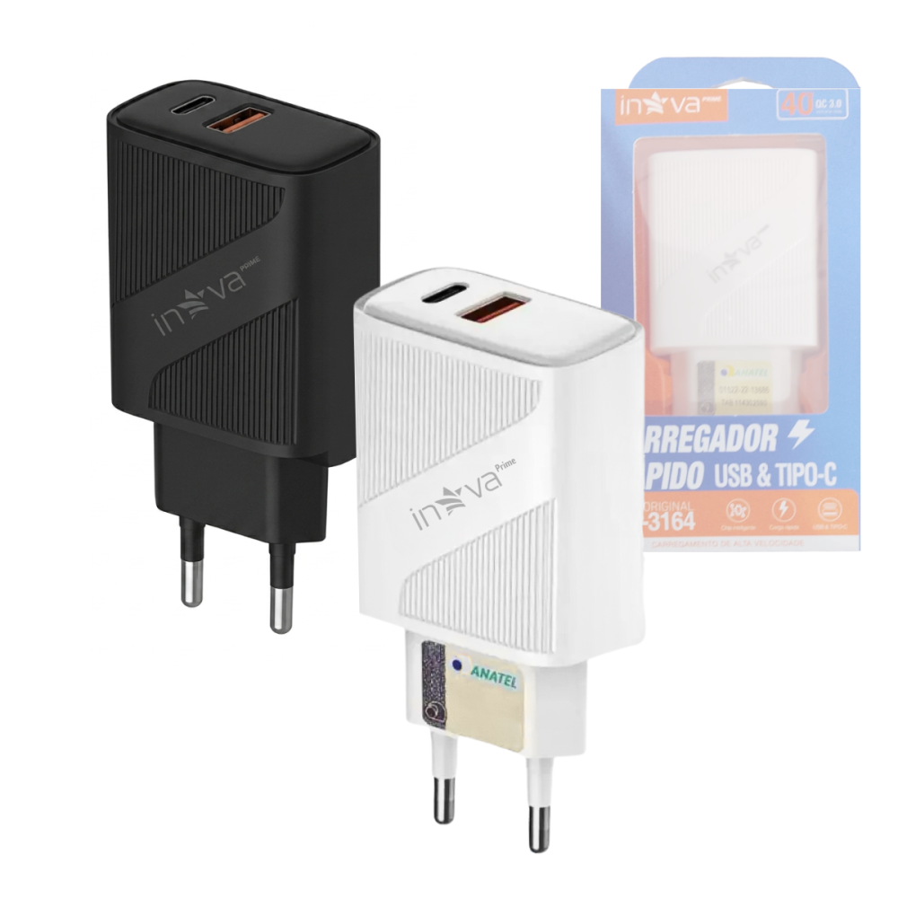 Fonte Carregador Rápido de 40W com Porta USB e TIPO-C INOVA KV-3164