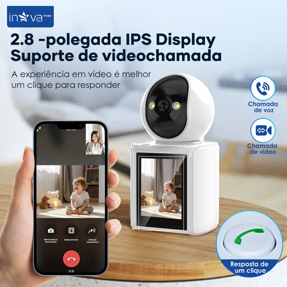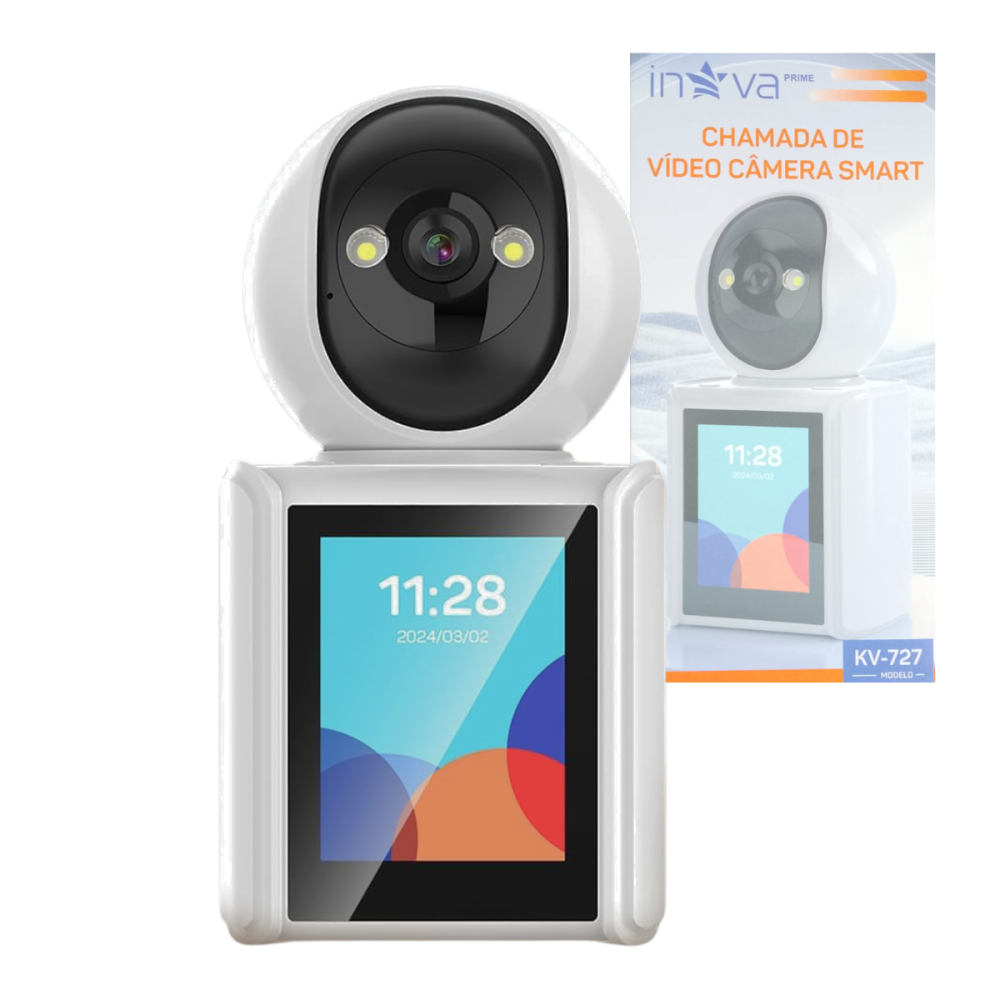 A Inova Prime KV-727 revoluciona o conceito de monitoramento residencial. Diferente das câmeras convencionais, ela possui uma tela LCD colorida que permite realizar chamadas de vídeo em tempo real.