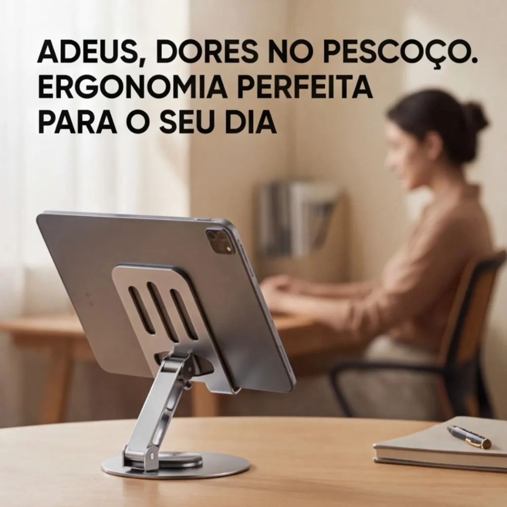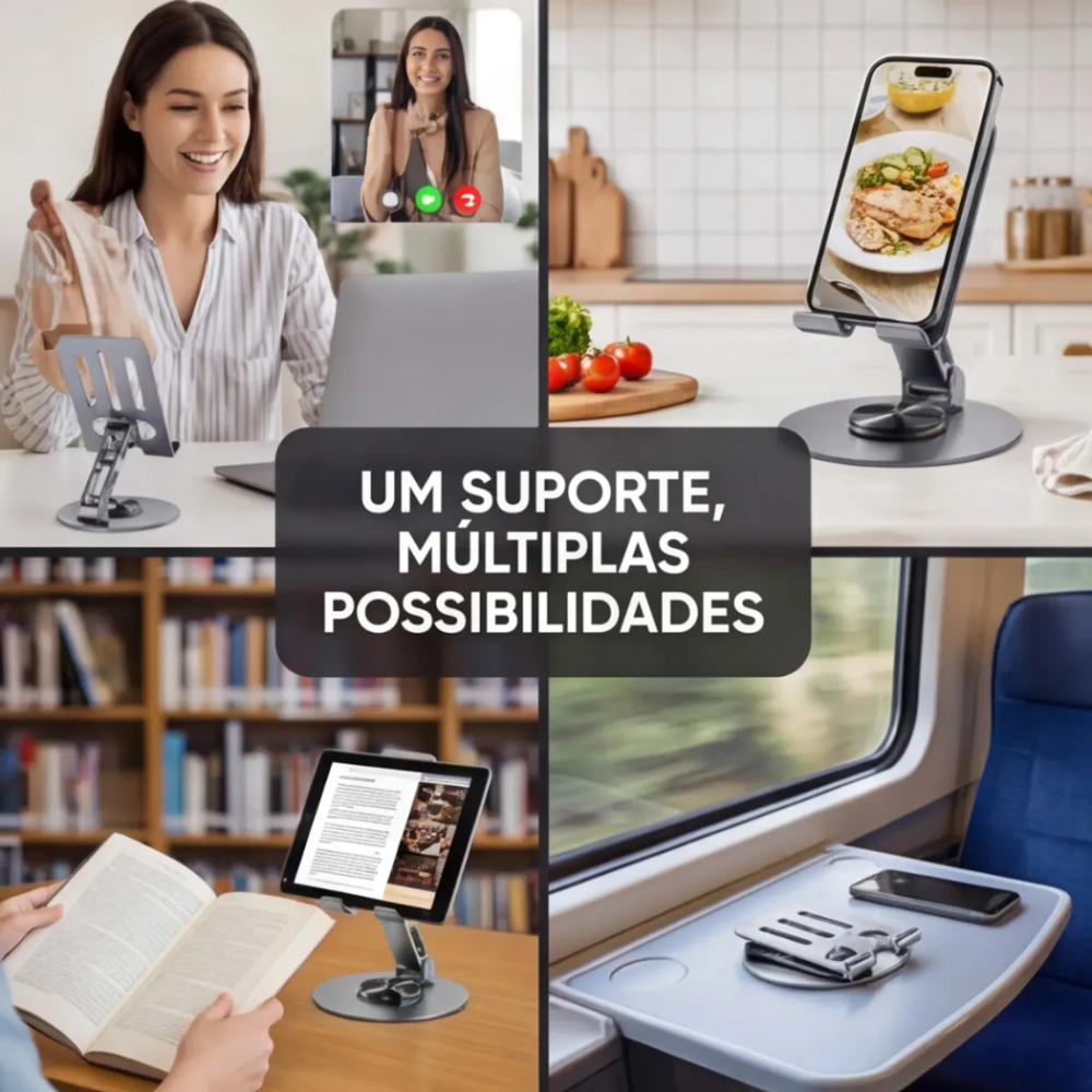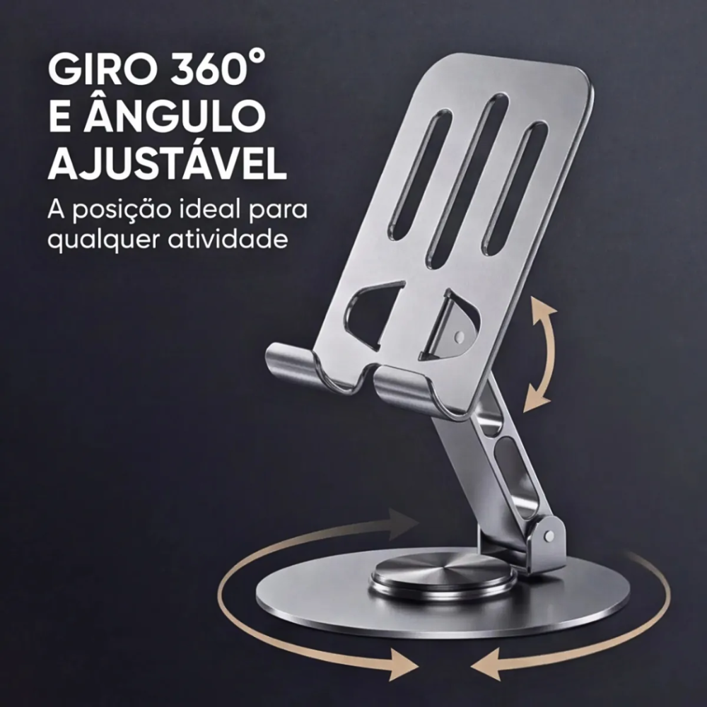-Rotação 360º com Clique: A base giratória permite rotacionar o dispositivo sem precisar levantar o suporte da mesa. Possui um mecanismo de "clique" que garante estabilidade na posição escolhida.