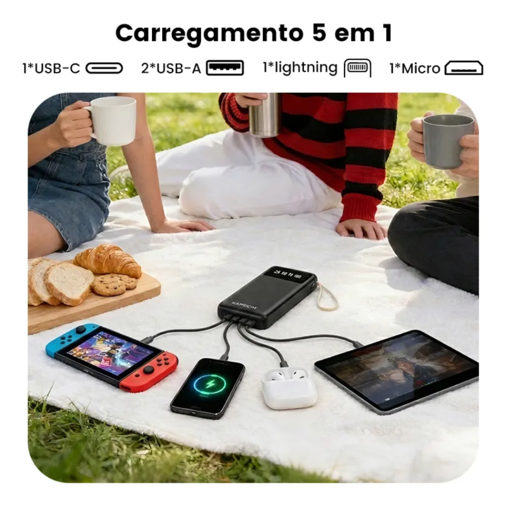 -Carga Simultânea: Permite carregar mais de um dispositivo ao mesmo tempo com estabilidade e segurança.