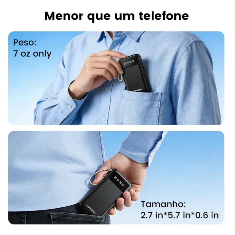 -Visor Digital LED: Diferente de modelos com luzes simples, este visor mostra em tempo exato (0 a 100%) quanta carga resta no Power Bank.