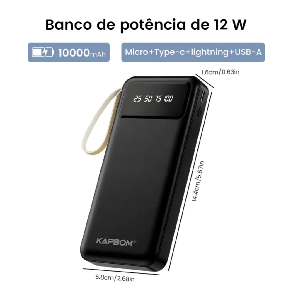 Com 10.000mAh de capacidade real, ele consegue recarregar seu smartphone várias vezes, e o melhor: os cabos já fazem parte do produto.