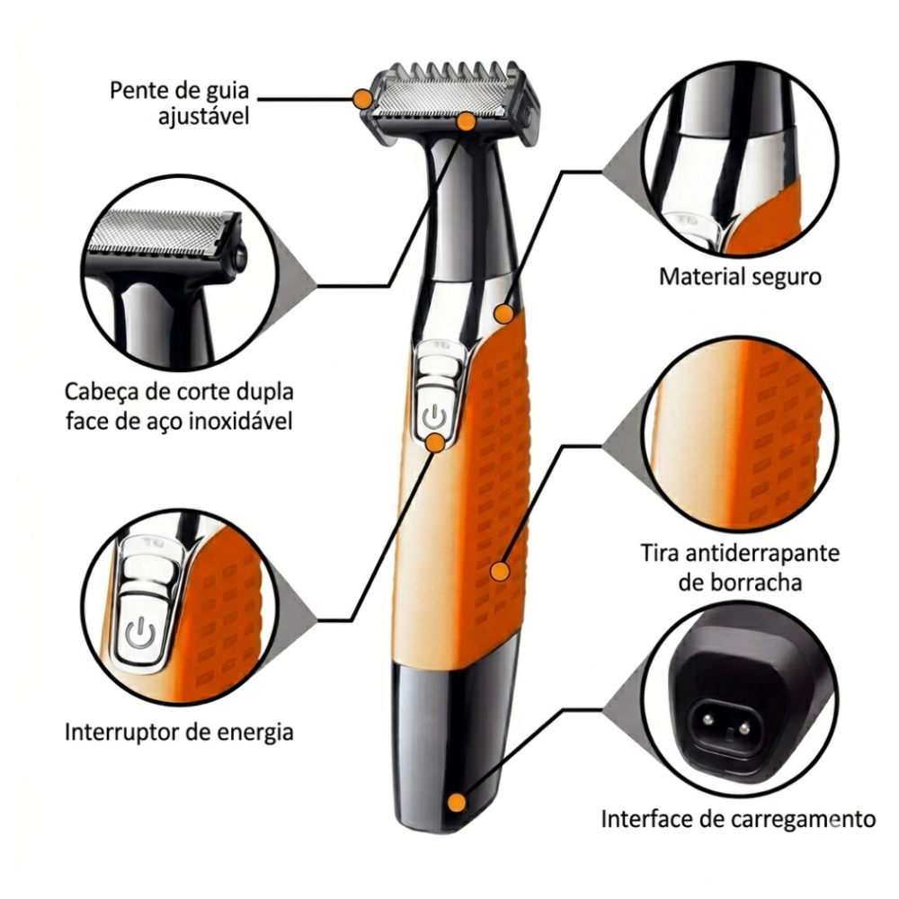 -Cabeça Flexível: Contorna as curvas do rosto e do corpo para um barbear mais rente e confortável.
