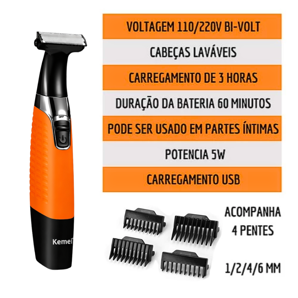 A KM-1910 é a solução definitiva para quem busca praticidade, segurança e um acabamento impecável. Projetada para ser utilizada em todo o corpo, ela apara, contorna e barbeia sem agredir a pele, graças à sua tecnologia de lâminas hipoalergênicas.