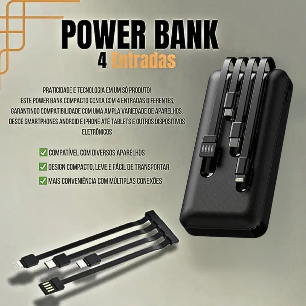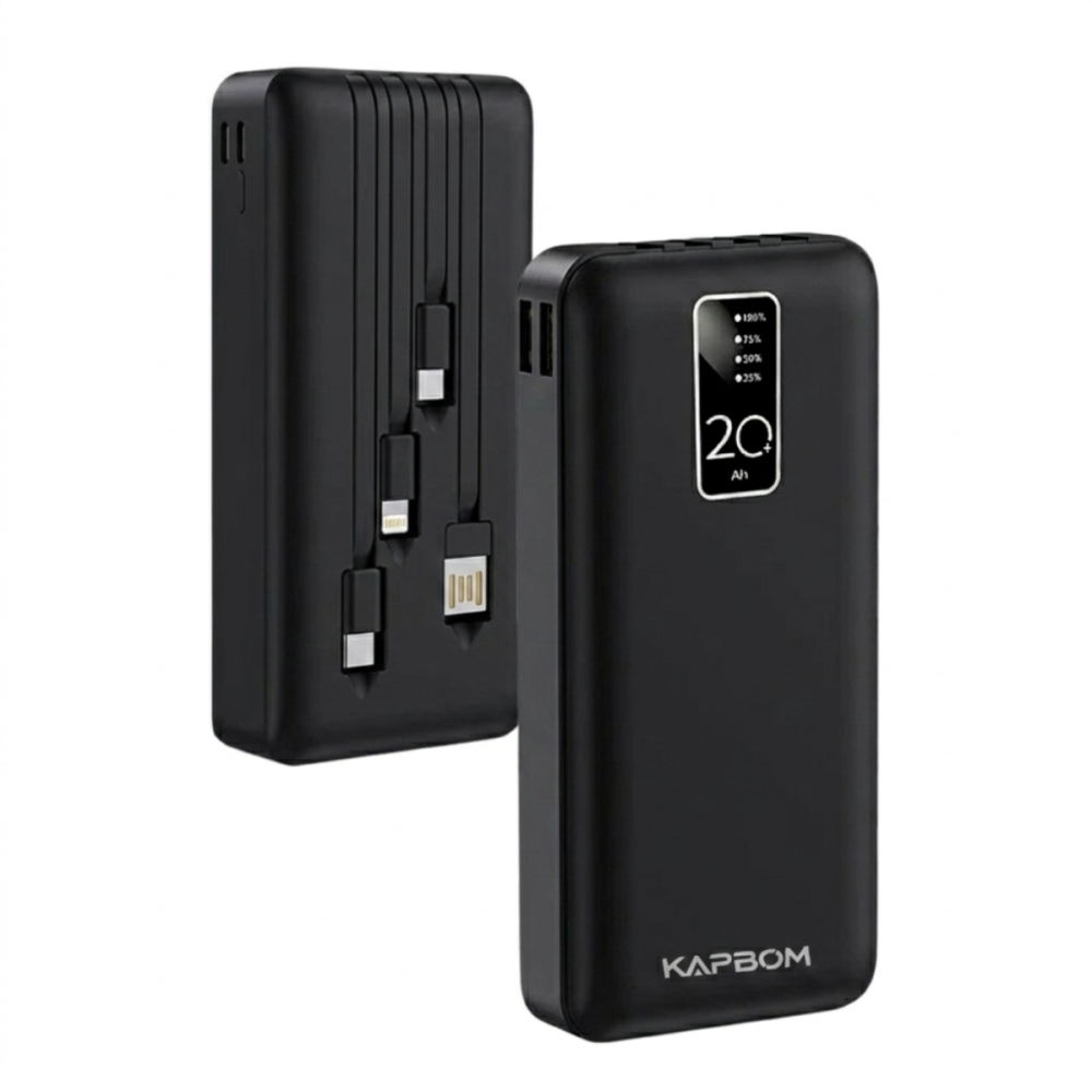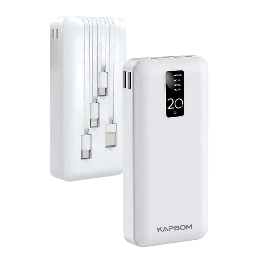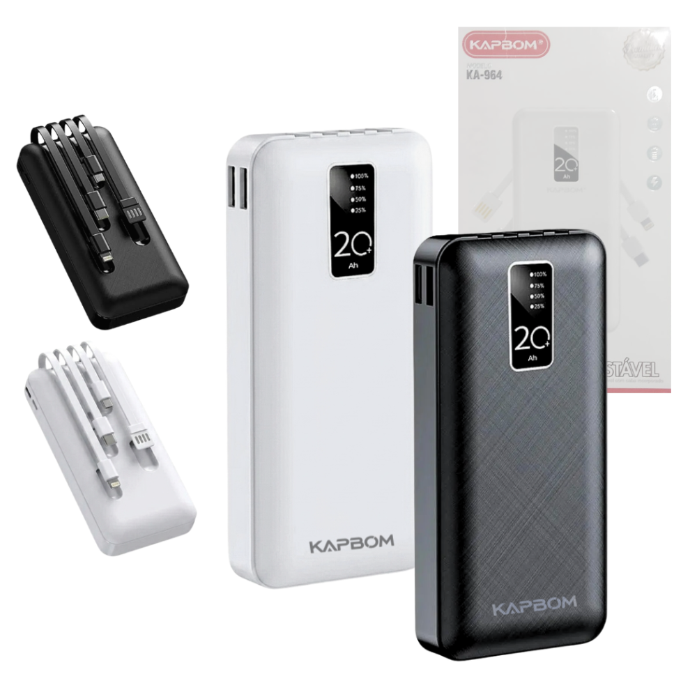 O Power Bank KA-964 é a solução definitiva para quem precisa de energia extra em qualquer lugar. Com uma capacidade real de 20.000mAh, ele garante múltiplas cargas para o seu smartphone, tablet ou outros dispositivos eletrônicos. Seu grande diferencial é a praticidade dos cabos já embutidos, eliminando a necessidade de carregar fios extras.