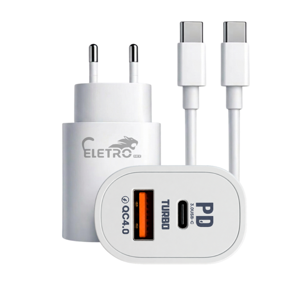 -- Carregador Completo Turbo 40W 9.1A Dual USB / Tipo-C e Cabo Tipo-C Eletromex EL-4016-CC