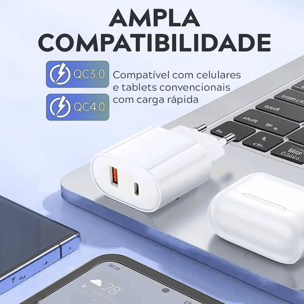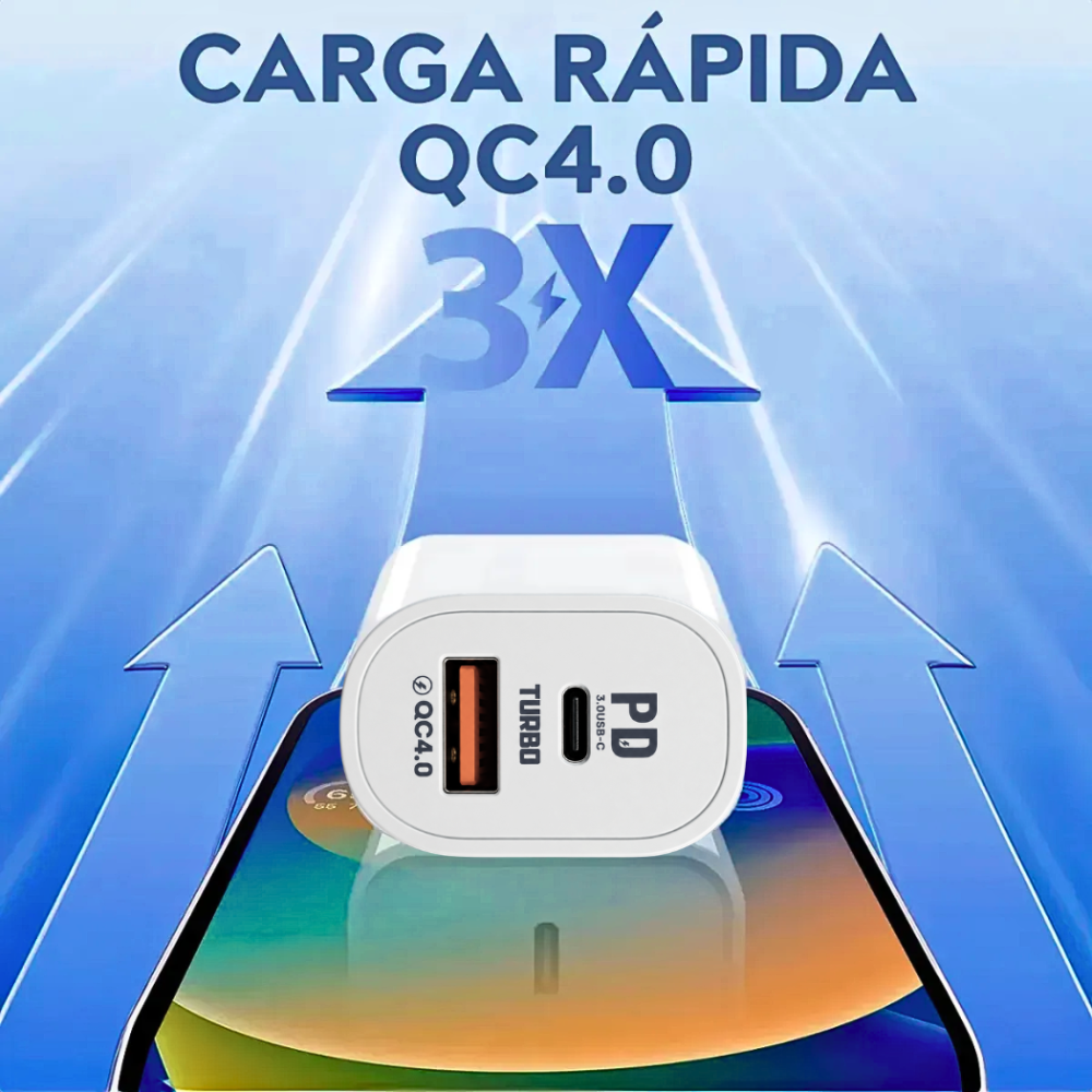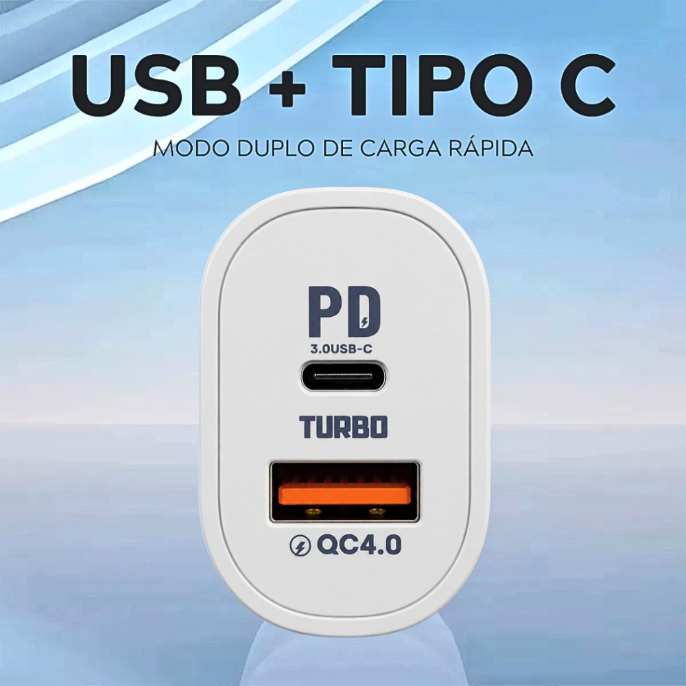 Carregador Completo Turbo 40W 9.1A Dual USB / Tipo-C e Cabo Tipo-C