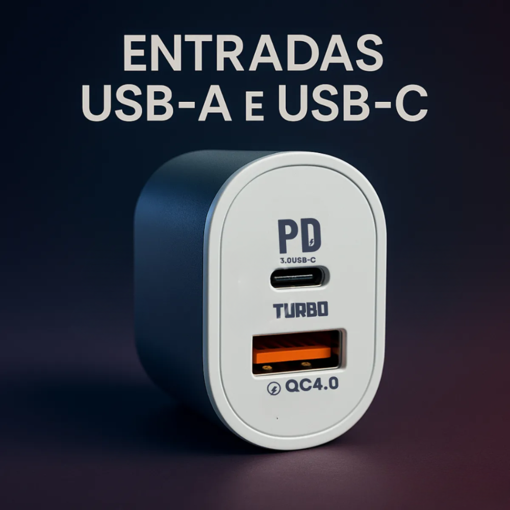 -2 Saídas: Porta USB e Tipo-C (Permite carregar até 2 aparelhos simultaneamente)
